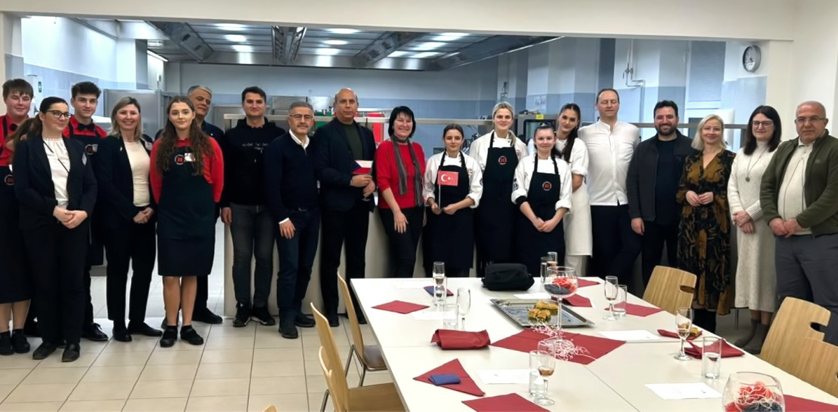 V minulém týdnu naši školu navštívili zástupci tureckého města Gaziantep, které je partnerským městem Ostravy. Hosté si během svého pobytu prohlédli prostory školy a seznámili se s jejím zázemím i nabídkou studijních oborů. Významnou součástí programu byla prezentace dovedností našich žáků. Žáci foodstylingového klubu a žáci 1. ročníku oboru Hotelový a restaurační provoz pod vedením zkušených pedagogů připravili slavnostní tabuli a čtyřchodové menu. Tímto způsobem reprezentovali své odborné znalosti, kreativitu i profesionální přístup. Menu bylo sestaveno tak, aby odpovídalo moderním trendům gastronomie. Hostům byly podávány