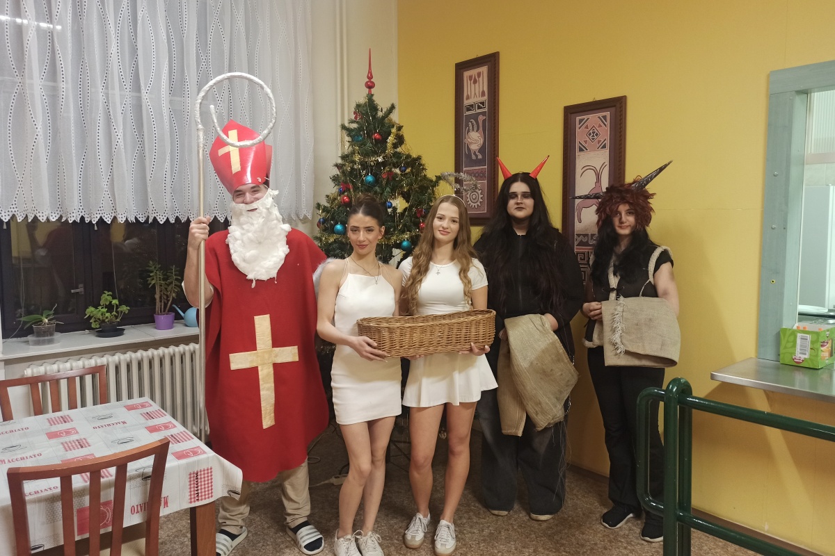 Letos k nám opět dorazil Mikuláš se svými anděly i čerty – tentokrát o den dřív, protože v pátek by na domově mládeže už nikoho nenašel a upřímně, vůbec by se nezlobil… práce by bylo míň a v košíku víc dobrot 😉. Svoji cestu začal v 17:30 na prvním patře, pokračoval do dalších pater a celé putování zakončil v jídelně. Během večera narazil na žákyně, které si pro něj připravily milá vystoupení – zahrály na kytaru, zazpívaly anglickou píseň nebo předvedly krátký taneček. Nechyběla ani klasika „Skákal pes přes oves“, která zazněla minimálně pětkrát 😄. Za odměnu andělé rozdávali čokoládové dobroty.