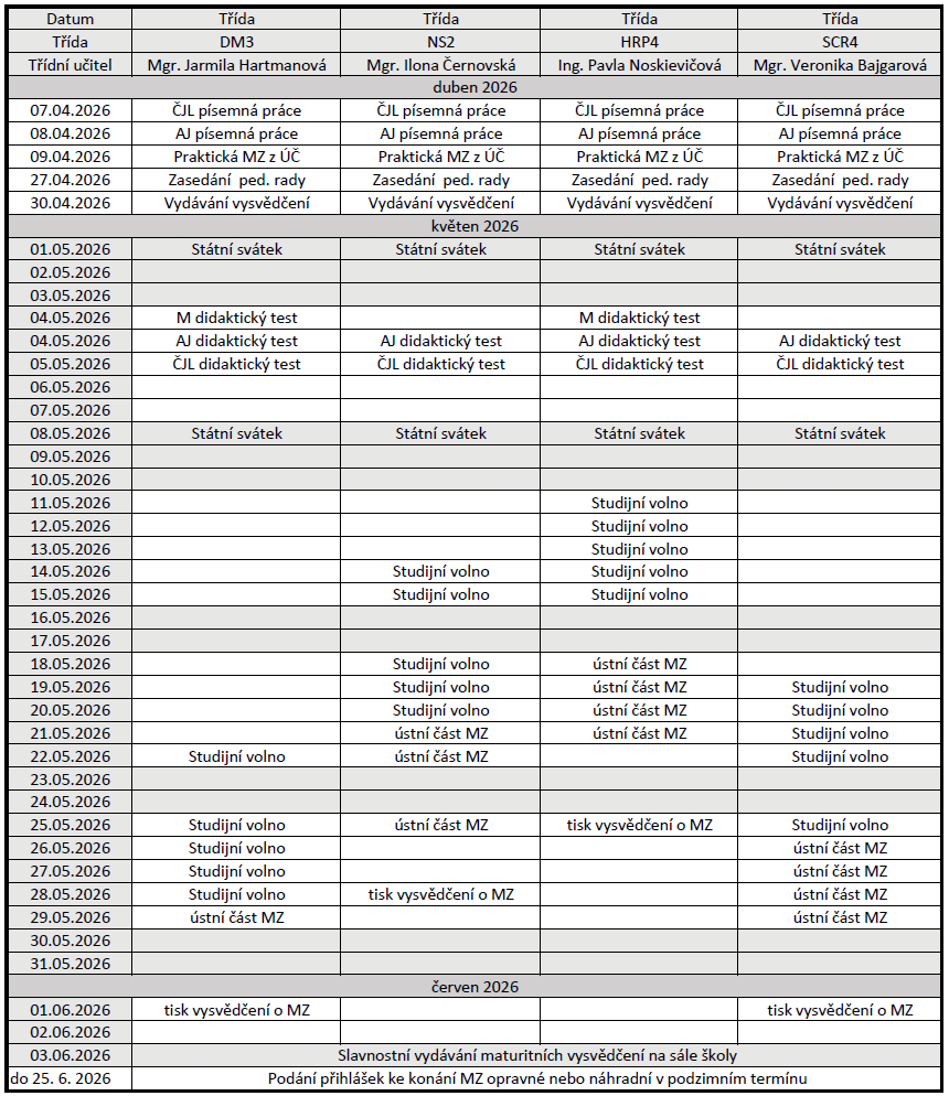Maturitní kalendář – jaro 2026