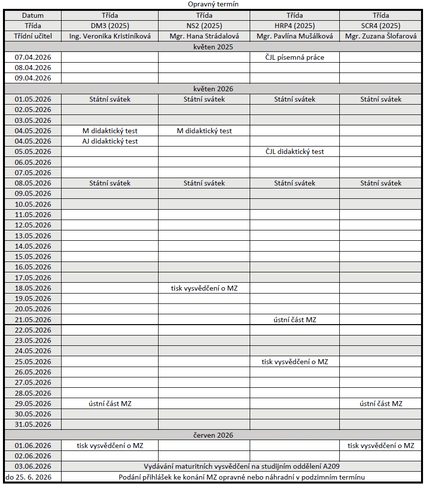 Maturitní kalendář – opravný termín – jaro 2026